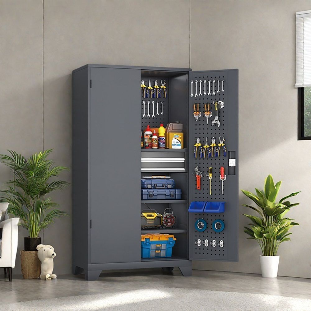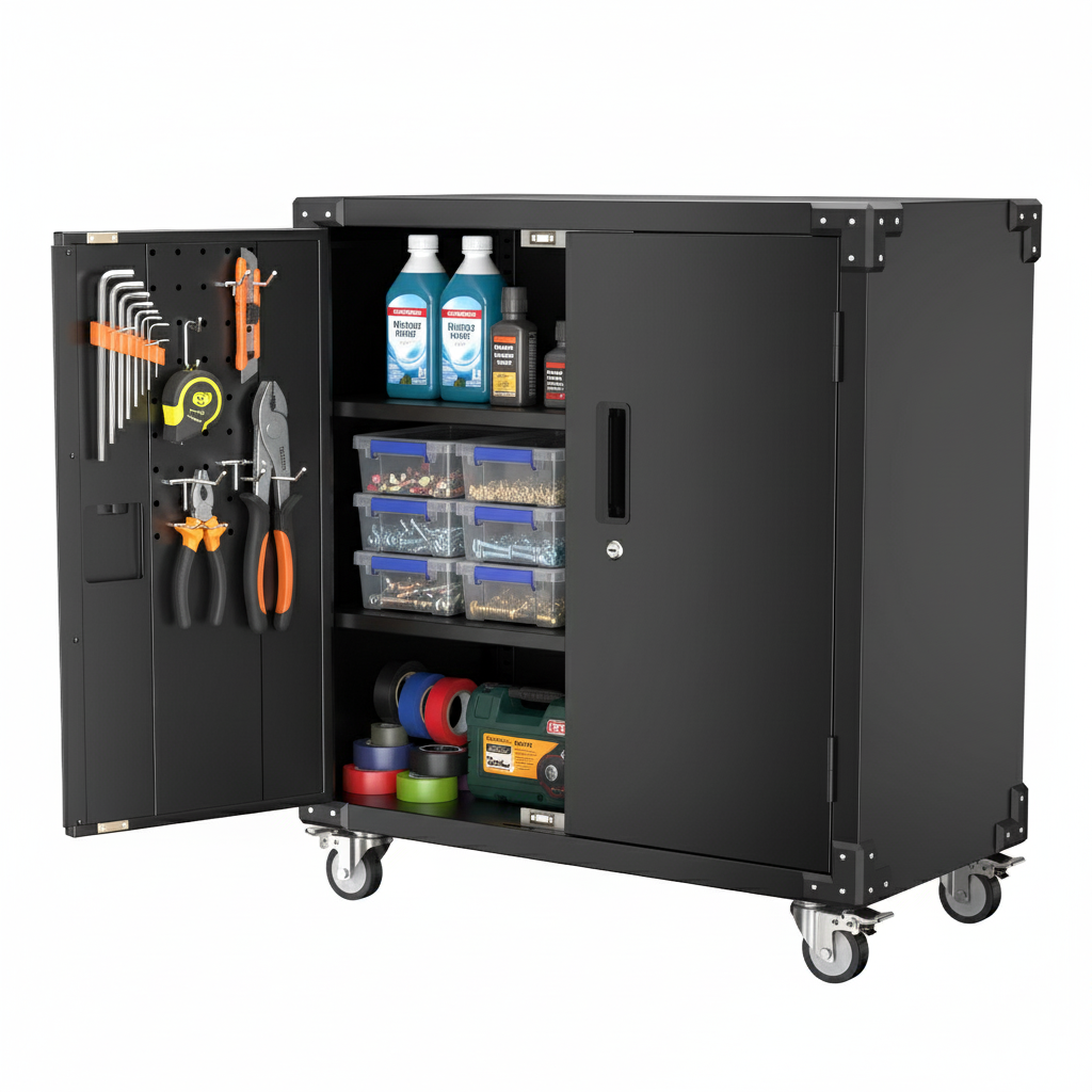 Its intelligent structure includes adjustable-height compartments, a secure locking system, movable wheels, as well as internal drawers and a tool hanging board – all creating a convenient storage system that allows users to arrange and locate items quickly and efficiently.